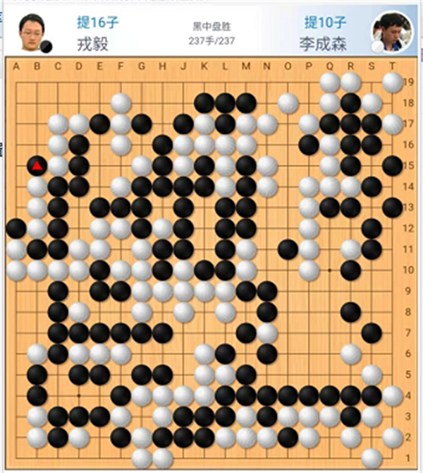 快棋臺由深圳隊(duì)的戎毅七段執(zhí)黑對陣天津隊(duì)的李成森五段。序盤平穩(wěn)過渡,進(jìn)入中盤時(shí)黑棋在白上方大空中試應(yīng)手,白棋最大程度強(qiáng)撐大空,留下隱患。在下方定型結(jié)束后,黑棋在白空中弈出巧手將白空打穿,取得領(lǐng)先。在劣勢情況下,白棋在爭搶官子時(shí)置中央大龍于不顧,黑棋攻殺白大龍順勢將白棋左下角吃掉,一舉獲勝。戎毅執(zhí)黑中盤勝李成森。