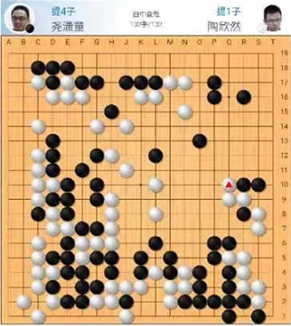 慢棋第四臺由深圳隊(duì)的陶欣然八段執(zhí)白對陣天津隊(duì)的堯?yàn)t童二段。雙方開局形成少見的新變化,白棋取得優(yōu)勢。之后白棋牢牢掌控局面,至132手兵不血刃快勝,陶欣然執(zhí)白中盤勝堯?yàn)t童。