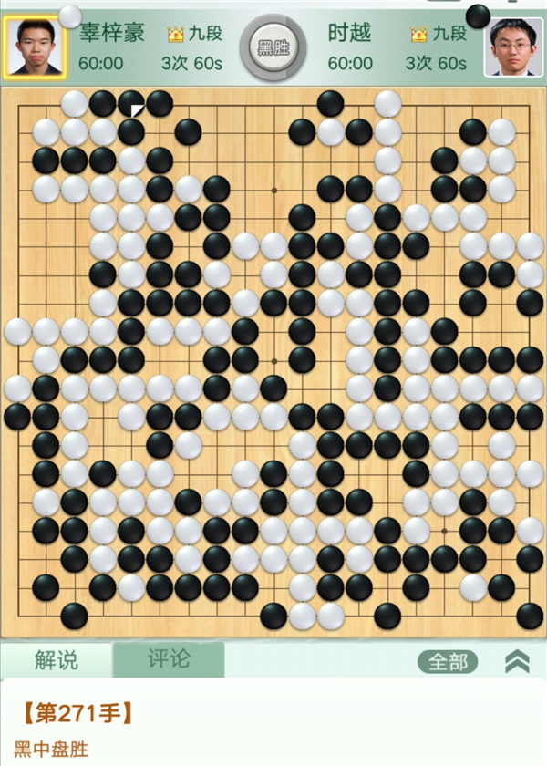 第四臺(tái)快棋,是兩位世界冠軍的對決,由深圳隊(duì)的時(shí)越九段執(zhí)黑快棋對陣江西隊(duì)的辜梓豪九段。開局至中盤雙方氣勢如虹,各自棄取,局面依然接近。之后黑棋下方定型失誤,白棋取得領(lǐng)先。在右下的劫爭中白棋判斷出現(xiàn)失誤,使黑棋扳回了局面。進(jìn)入官子階段,黑棋不顧中央隱患搶占右邊官子,白棋如果抓住機(jī)會(huì)在中央黑空出棋形成劫爭則局面復(fù)雜。實(shí)戰(zhàn)白棋沒敢開劫而是繼續(xù)收官,黑棋補(bǔ)棋后穩(wěn)固了勝勢,時(shí)越執(zhí)黑中盤勝辜梓豪。