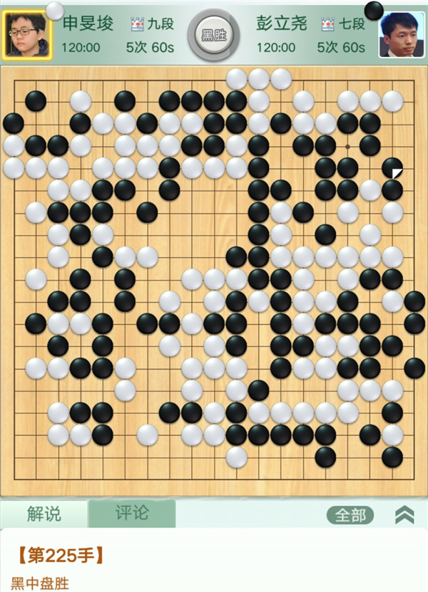 第三臺(tái)慢棋,由深圳隊(duì)外援申旻埈九段執(zhí)白對陣彭立堯七段。開局右邊黑棋行棋過分,但白棋對殺時(shí)出現(xiàn)較大失誤,將雙活走成被殺,黑棋大幅領(lǐng)先。之后黑棋右上角又出現(xiàn)失誤,將一塊棋送死,局面接近。上方作戰(zhàn)雙方都有一定的失誤,形勢劇烈波動(dòng),最終形成打劫。黑棋依仗劫材有利,放棄左上角將右上吃掉白棋棋筋活出,便宜巨大,獲得最終勝利,申旻埈執(zhí)白中盤負(fù)彭立堯。這一盤,教練羅洗河九段認(rèn)為“下得是真奇葩!”