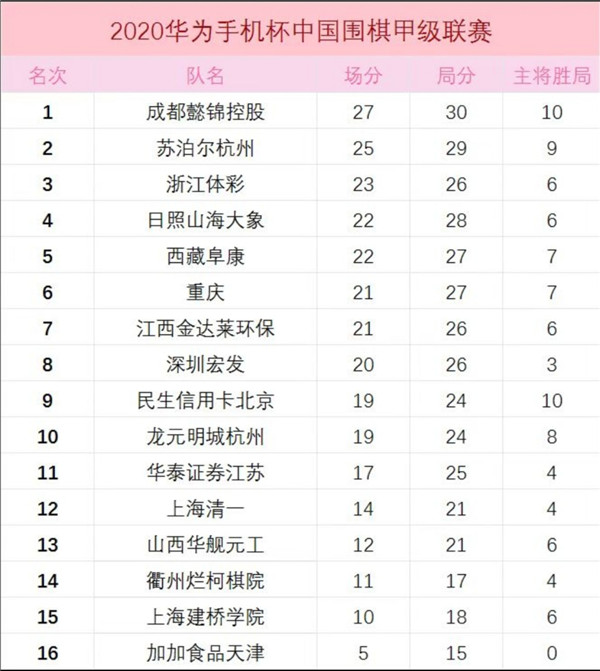 本輪其它隊(duì)賽果如下:衢州爛柯棋院0:4負(fù)西藏阜康;成都懿錦控股3:1勝日照山海大象;上海清一隊(duì)3:1勝華泰證券江蘇;民生信用卡北京4:0勝天津加加食品;重慶1:3負(fù)蘇泊爾杭州;山西華艦元工4:0勝上海建橋?qū)W院;浙江體彩2:2主將負(fù)龍?jiān)鞒呛肌?/p>