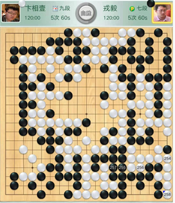第二臺(tái)主將臺(tái),由深圳隊(duì)戎毅七段執(zhí)黑對陣江西隊(duì)外援卞相壹九段。開局黑取實(shí)地白取外勢,局面接近。中盤黑棋在中央放棄出頭花兩手棋吃掉左下角白棋稍小,白棋棄角后圍住中央巨空,白稍好。官子階段白棋左上形狀處理有誤,黑棋未能抓住沖擊機(jī)會(huì),選擇大幅退讓,最終目數(shù)不夠。戎毅執(zhí)黑負(fù)卞相壹。