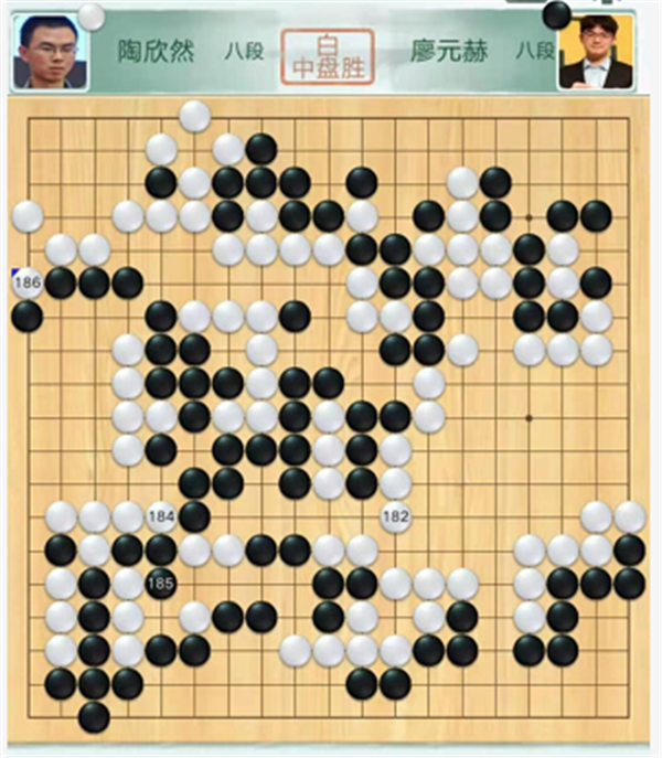 第四臺(tái)慢棋,由深圳隊(duì)陶欣然八段執(zhí)白對(duì)陣成都隊(duì)廖元赫八段。中央戰(zhàn)斗時(shí)候白棋選擇退讓?zhuān)吹剐纬纱蚪?,黑棋劫勝后大幅領(lǐng)先。之后黑棋官子階段不夠冷靜細(xì)膩,幾處小虧損之后被白反超。黑棋看到局面危險(xiǎn)更加沖動(dòng)的選擇和白棋互相破空,結(jié)果又虧損導(dǎo)致差距越來(lái)越大。陶欣然執(zhí)白中盤(pán)勝廖元赫。