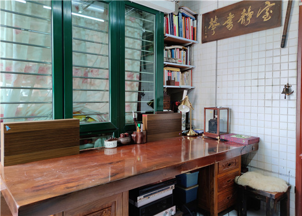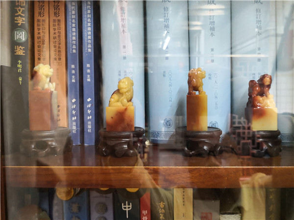 書房約莫20平米不到,擺設(shè)裝點(diǎn)里透射出寧老師的日常。當(dāng)陽光照進(jìn)這間寧靜的小屋,他習(xí)慣于先打開音樂,在舒心樂聲中開始他一天讀書、刻印的生活。累了,在小桌上喝喝茶,或彈上一段古琴,或者玩賞一下他收藏的心愛鈴鐺。據(jù)介紹,他專門收藏西北一帶富貴人家的馬鈴,目前有100余個(gè)。寧老師說,“讀書、養(yǎng)性、積德、延年”是其志向,井井有條、一絲不茍的書房就是佐證。長期的濡養(yǎng),讓人感到寧老師的談吐從容、情趣高雅、思想深刻。映照在篆刻上,寧老師的印作也日漸沉穩(wěn)大氣,除姓名印章外,所刻內(nèi)容啟人心智,如“以正大立心”“以光明行事”“修辭立其誠”等等。