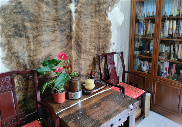 俗話說得好:見識(shí)一個(gè)素養(yǎng),看看他的書房就知道了!那么,寧起興老師的書房是什么樣的呢?第一印象:簡潔、古樸、有趣味。一眼掃去,臨窗一張紅木桌,兩個(gè)裝得滿滿的老書柜,兩張烏黑發(fā)亮的南官帽椅,中間配有一張老舊的喝茶的原木桌,正上方的墻面掛著一整張大大的南美阿根廷牛皮。墻上橫掃,掛有“室靜書馨”的書法作品,一張古琴,一把薩克斯,幾份有關(guān)他篆刻宣傳的剪報(bào),還有星星點(diǎn)點(diǎn)的各類鈴鐺。細(xì)看呢:書柜里的篆刻工具書,有大部頭的字典、印譜和系列叢書,也有與篆刻相關(guān)的文化類書籍,大多插滿了顏色各異的標(biāo)簽,可見寧老師讀書的細(xì)致與用心。紅木大桌上有一對(duì)大音箱,是原裝進(jìn)口的德國貨;桌子旁,有一正方形的小桌特別顯眼,寧老師帶著些許自豪的神態(tài)介紹說,鉗臺(tái)是德國進(jìn)口的,鋸子也是原裝進(jìn)口的,那個(gè)刻銅印的印盤是定制的。還有,他所用的刻刀頂端印有l(wèi)ogo,是小篆“寧”字與工字的合寫,該刀鋼材鈷含量為17%,也是定制的。正所謂“工欲善其事,必先利其器”,寧老師深以為然。是以,他在工具上追求“高精尖”甚至不惜工本。