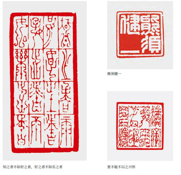 說起自己的代表作,寧老師十分謙虛,但筆者還從他的印屏、印作中,從以往宣傳報(bào)道中理出了一些頭緒。比如,剛來深圳,有感于鄧小平同志的功績,刻了一方《總設(shè)計(jì)師鄧小平》,陳巨來的印味明顯。2013年寶安區(qū)書法協(xié)會(huì)發(fā)行新年掛歷上印有“蛇年大吉”印章,便出自他手。那是一方金文白文印,整體舒朗開闊,靈動(dòng)高古,爛漫天成,不失為其代表作。還有,用一方印完整地刻出了268字的《心經(jīng)》亦是獨(dú)一無二的。他為友所刻《真善美》朱文鳥蟲篆,布局疏密自然,光潔妍美,婀娜多姿,韻味無窮。元朱文白文印《熊須健一》,疏密呼應(yīng),“一”字處大片留紅,與另三字形成強(qiáng)烈對(duì)比,“須”字三撇作美化處理,形成印眼。此印工穩(wěn)爽朗,行刀如筆,耐人尋味。還有應(yīng)約為著名棋手武宮正樹、徐瑩等所刻鳥蟲篆印均“嵌入”圍棋黑白二子的元素,自然貼切,又妙趣橫生。還有為出版社、書局、書籍插圖以及賽事配刻的印章更是數(shù)不勝數(shù)。當(dāng)前,寧老師依然精神飽滿、創(chuàng)作旺盛,相信未來還會(huì)不斷有令人驚喜的印品佳作問世。