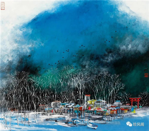 宋玉明從金陵畫派的新傳統(tǒng)跨越到城市表現(xiàn)的積彩拓墨畫法,既體現(xiàn)了現(xiàn)代化城市對(duì)于變革傳統(tǒng)的時(shí)代訴求,也體現(xiàn)了他移居深圳后這座新興城市文化對(duì)于他的深刻影響。畢竟,連續(xù)數(shù)屆的深圳水墨雙年展對(duì)于水墨在跨文化中重要作用與表現(xiàn)方法的突破,都給予他至深的思想開拓。這表明,城市山水畫已不單純是用中國(guó)畫表現(xiàn)城市的命題,而是其中能夠蘊(yùn)含多少城市文化觀念與城市審美的方法,宋玉明對(duì)于城市山水畫的探索,體現(xiàn)的正是這樣一種對(duì)城市現(xiàn)代文化的思想融合性。而不拘謹(jǐn)于城市一磚一石、一街一道、一房一樓的描繪,著眼于發(fā)揮水墨與彩墨表現(xiàn)的自由性,抑或體現(xiàn)了人性、自然與現(xiàn)代城市共同作用的現(xiàn)代生活方式與人文理想。的確,純粹用中國(guó)畫或水墨畫來探索城市的現(xiàn)代化景觀表現(xiàn),也許只是淺層次的審美需求;而只有當(dāng)把山水畫作為人與自然和諧統(tǒng)一的觀念表達(dá)植入城市現(xiàn)代化的審美訴求時(shí),城市山水畫才能真正凸顯出其深刻的美學(xué)價(jià)值。這正是我們從宋玉明的作品里能夠讀解到的他對(duì)于城市山水畫審美理想的一種勾畫。