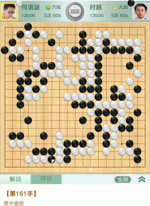 緊接著,一臺(tái)時(shí)越九段執(zhí)黑對(duì)何語涵六段干凈利落,時(shí)越在對(duì)局中充分發(fā)揮自身勢(shì)大力沉的棋風(fēng),以凌厲的屠龍刀法絕殺一條大龍,痛快淋漓地結(jié)束了戰(zhàn)斗。關(guān)鍵節(jié)點(diǎn)在中盤,黑棋對(duì)右邊白子簡單吃住尾巴則優(yōu)勢(shì),實(shí)戰(zhàn)黑棋追求整體殺白,白棋應(yīng)對(duì)失誤大龍憤死,行棋161手。