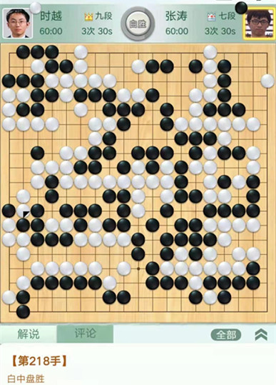 時(shí)越快棋執(zhí)白對(duì)陣張濤。右邊作戰(zhàn)時(shí)候,黑棋沒(méi)有選擇造劫劫爭(zhēng)而是退讓,被白將右邊幾子吃掉后又吃掉右上黑棋,黑棋局面落后。之后黑棋右下又死活看錯(cuò)被白先手活出,導(dǎo)致雪上加霜,實(shí)際上棋局已經(jīng)結(jié)束。