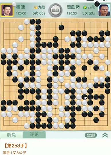 陶欣然執(zhí)黑對(duì)陣檀嘯。中盤白棋在右邊下出緩手,導(dǎo)致攻守逆轉(zhuǎn),白棋被迫做劫求活。黑棋利用劫爭(zhēng)中央連走兩手獲利巨大。之后黑棋穩(wěn)健收官將優(yōu)勢(shì)保持至終局。