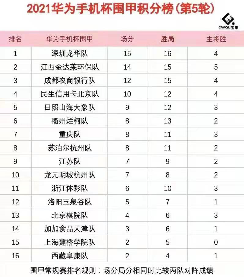第五輪各隊(duì)?wèi)?zhàn)況如下:衢州爛柯4比0勝加加食品天津;浙江體彩隊(duì)1:3深圳龍華隊(duì);日照山海大象隊(duì)1:3江西金達(dá)萊環(huán)保隊(duì);重慶隊(duì)3比1民生信用卡北京隊(duì);成都農(nóng)商銀行隊(duì)3:1勝江蘇隊(duì);西藏阜康2:2主將勝上海建橋?qū)W院;北京棋院隊(duì)2:2主將勝洛陽(yáng)玉泉谷隊(duì);蘇泊爾杭州2:2主將負(fù)龍?jiān)鞒呛贾?。第一階段結(jié)束,深圳龍華隊(duì)五戰(zhàn)全勝積15分居“魁首”,江西金達(dá)萊環(huán)保隊(duì)僅以一分之差緊隨其后,成都農(nóng)商銀行隊(duì)積12分居第三位。
