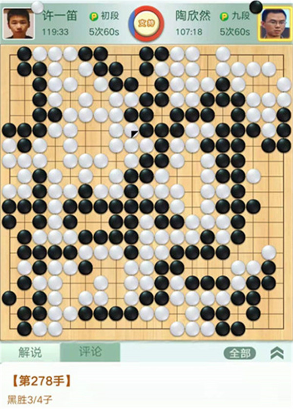陶欣然執(zhí)黑對(duì)陣新初段許一笛。開局下邊黑棋稍虧,之后在左下角獲得便宜黑棋領(lǐng)先。大官子黑棋有所失誤局勢(shì)又是白好。之后小官子時(shí)候白棋又有失誤,黑棋幸運(yùn)的3/4子獲勝。