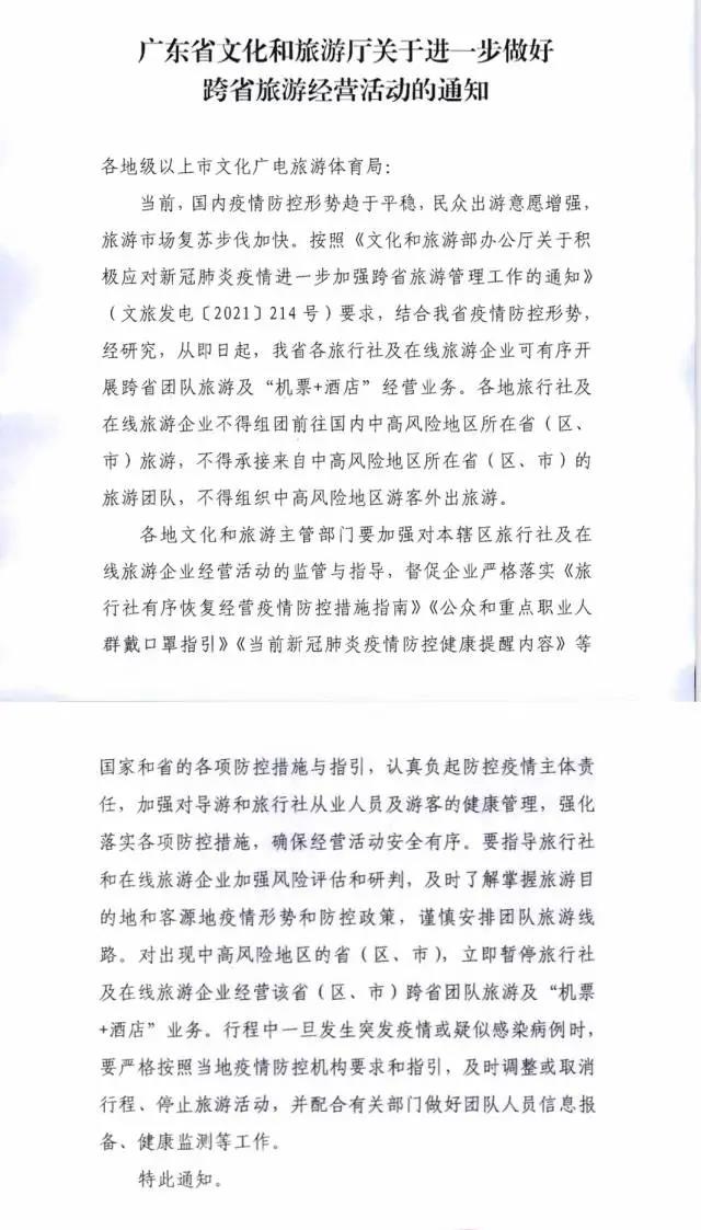 深圳新聞網(wǎng)2021年8月25日訊 (記者 田志強(qiáng))廣東省文化和旅游廳今日發(fā)布《關(guān)于進(jìn)一步做好跨省旅游經(jīng)營活動的通知》,通知明確:從即日起,我省各旅行社及在線旅游企業(yè)可有序開展跨省團(tuán)隊(duì)旅游及“機(jī)票+酒店”經(jīng)營業(yè)務(wù)。各地旅行社及在線旅游企業(yè)不得組團(tuán)前往國內(nèi)中高風(fēng)險(xiǎn)地區(qū)所在省(區(qū)、市)旅游,不得承接來自中高風(fēng)險(xiǎn)地區(qū)所在?。▍^(qū)、市)的旅游團(tuán)隊(duì),不得組織中高風(fēng)險(xiǎn)地區(qū)游客外出旅游。