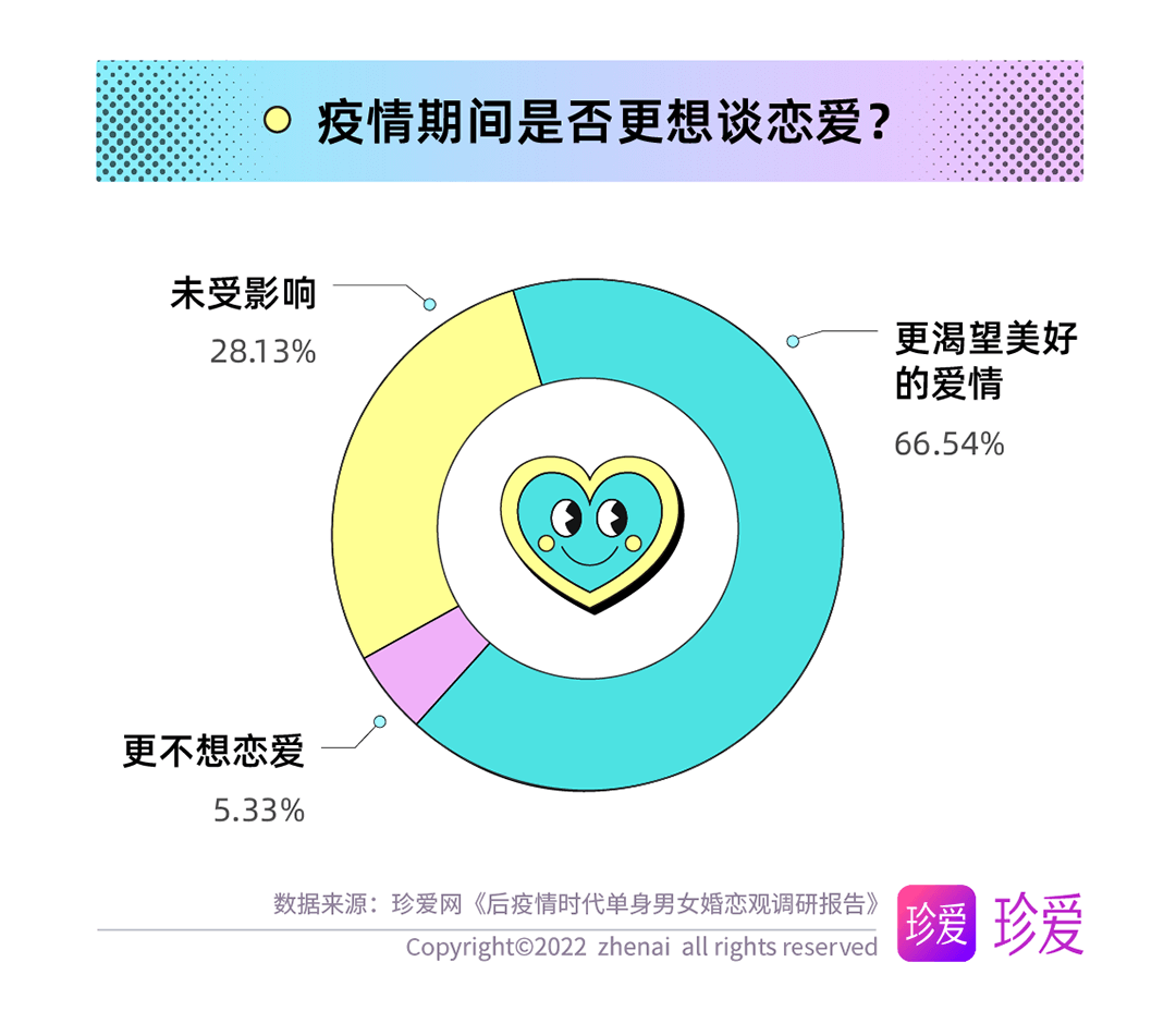 數(shù)據(jù)顯示,近七成人經(jīng)過疫情后更渴望美好的愛情;人們的脫單進度也受到了疫情影響,超七成人使用社交軟件增加戀愛幾率;超八成人的擇偶標準在經(jīng)歷疫情后發(fā)生變化,最看重對方的性格、健康狀態(tài)及價值觀;近半數(shù)人對異地戀的接受程度下降;性格合拍、真心相愛、三觀相合成為人們心中理想婚姻的最重要因素。