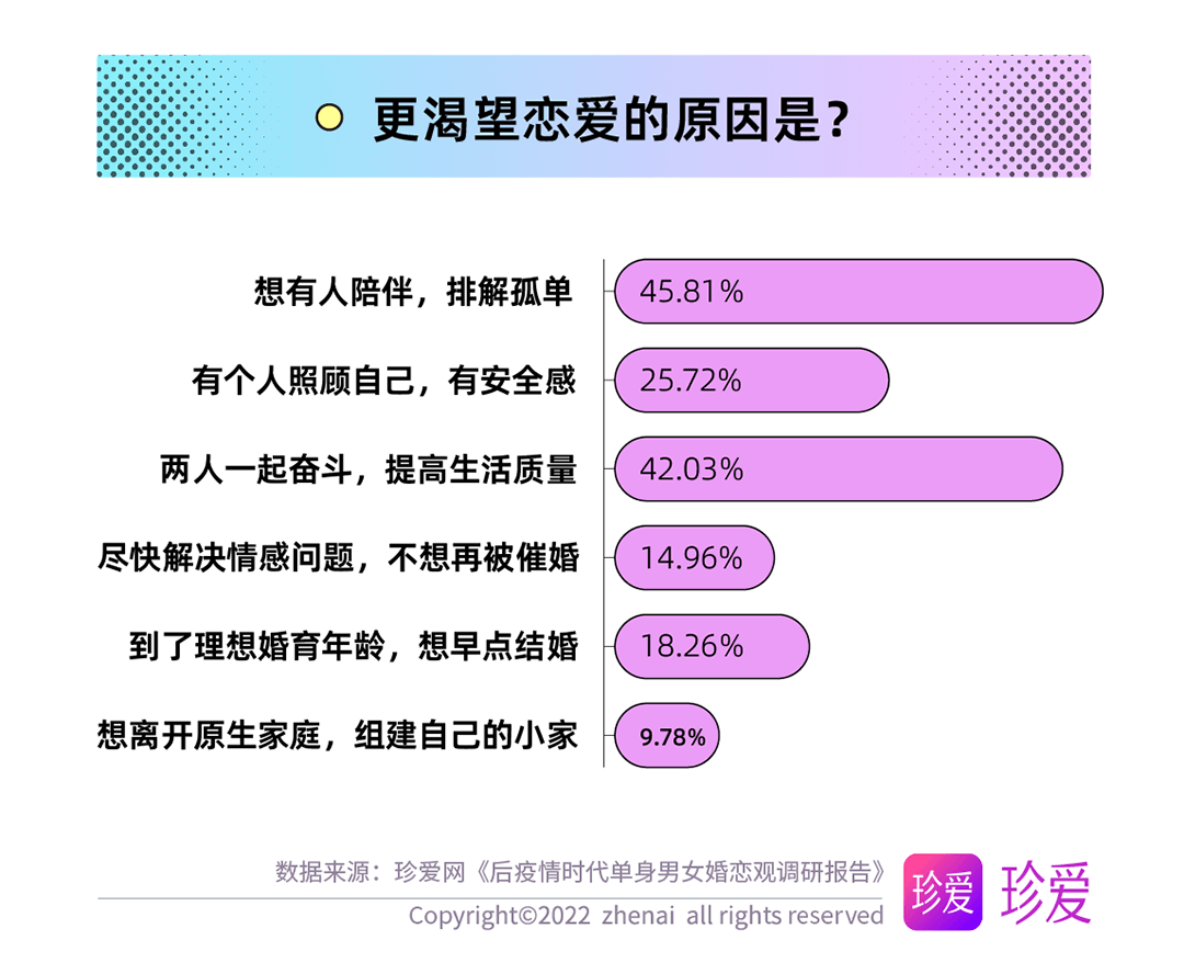 珍愛情感研究院院長張莎莎分析指出,在疫情這一特殊時期,獨自居家隔離、對疫情傳播風險的焦慮以及目睹很多行業(yè)受到?jīng)_擊等因素使得人們缺乏安全感,更加渴望戀愛。同時,張莎莎也表示,疫情之下,脫單其實也沒有想象中那么難,正如調研數(shù)據(jù)顯示,雖然線下社交受限,單身人群仍有很多交友的方式可以嘗試。當脫單進度受阻,人們難免會出現(xiàn)無力感以及焦慮、不安等情緒,遇到這種情況,大家可以通過固定作息時間、發(fā)展興趣愛好等調節(jié)情緒,也可以求助珍愛網(wǎng)等婚戀服務平臺,通過專業(yè)婚戀服務更精準、快速地找到合適的另一半。
