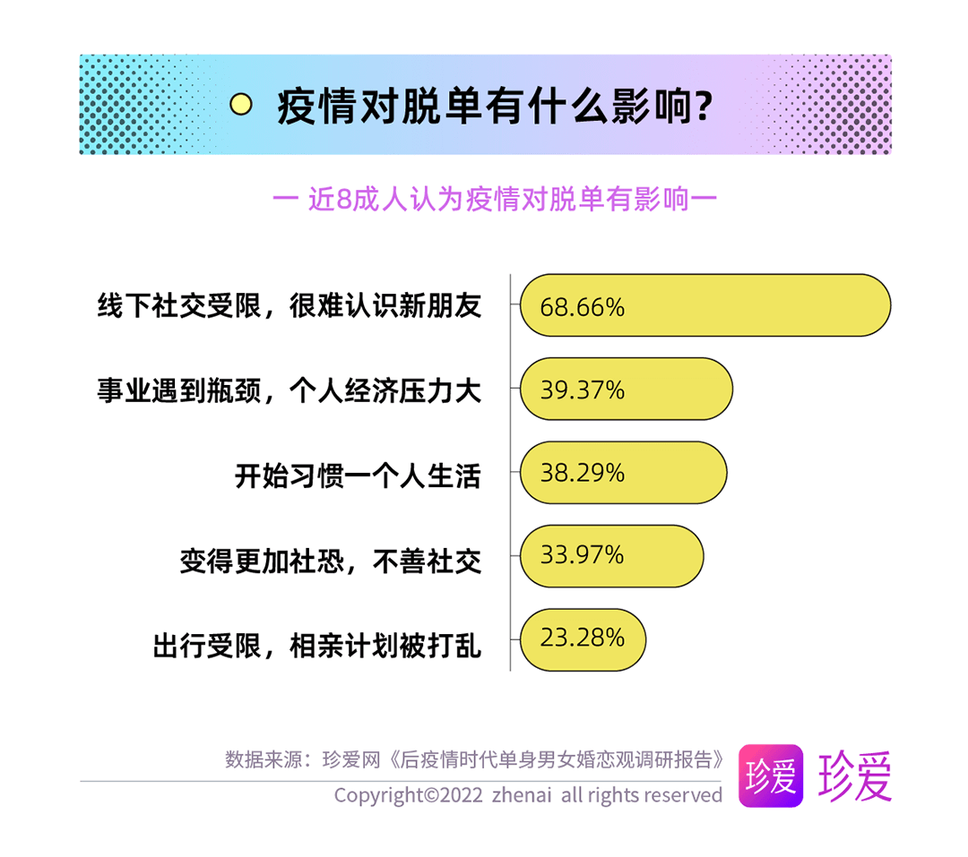多數(shù)人都更渴望愛情,但疫情也對脫單進程產(chǎn)生了一定影響。報告顯示,近八成人認為疫情對脫單有影響,其中首要影響為線下社交減少導致很難認識新朋友(68.66%),其次為日常出行受限因此相親計劃被打亂(39.37%),此外還有開始習慣一個人生活、事業(yè)遇到瓶頸導致的個人經(jīng)濟壓力大、更加“社恐”等影響。