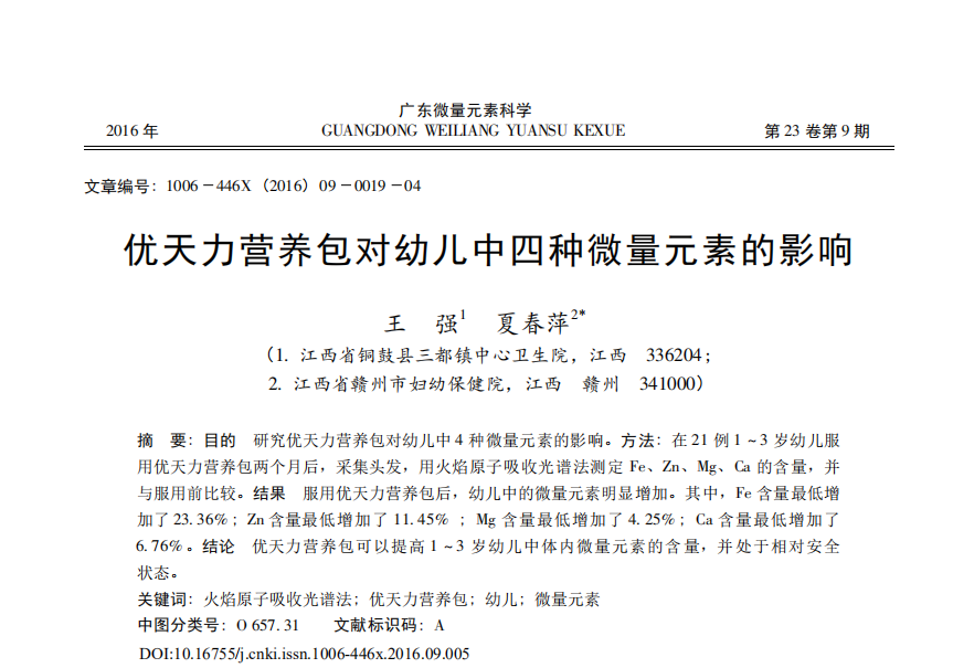王強(qiáng),夏春萍.優(yōu)天力營(yíng)養(yǎng)包對(duì)幼兒中四種微量元素的影響[J].廣東微量元素科學(xué),2016