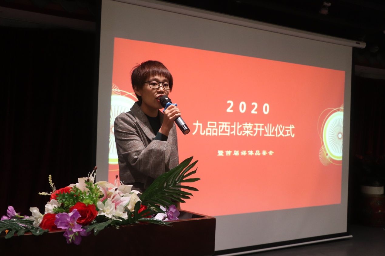 本屆媒體品鑒會由“九品西北菜”創(chuàng)始人兼出品總監(jiān)賈淑萍女士歡迎致辭,并且分享了關(guān)于品牌創(chuàng)始背后的故事?!熬牌肺鞅辈恕笔莾A金河建材集團之力,萃取20多年用心精華,嚴格把控菜品供應(yīng)鏈,歷史20年,打造出來的新品牌。