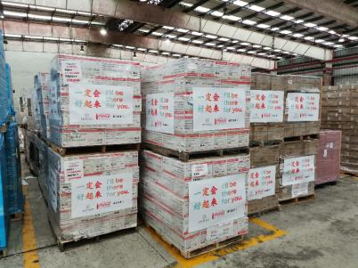 可口可樂系統(tǒng)員工志愿者在海關(guān)協(xié)助醫(yī)療物資裝車