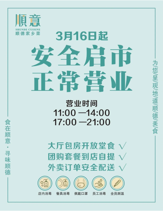 近日,記者發(fā)現(xiàn),深圳人喜愛的順德菜之一順意順德家鄉(xiāng)菜深圳3家門店福華一路店、車公廟店、科技生態(tài)園店已于3月16日全面恢復(fù)正常營(yíng)業(yè),同時(shí),大廳包房均可開放堂食,外賣服務(wù)同樣進(jìn)行中,不方便到店消費(fèi)的也可以叫外賣。