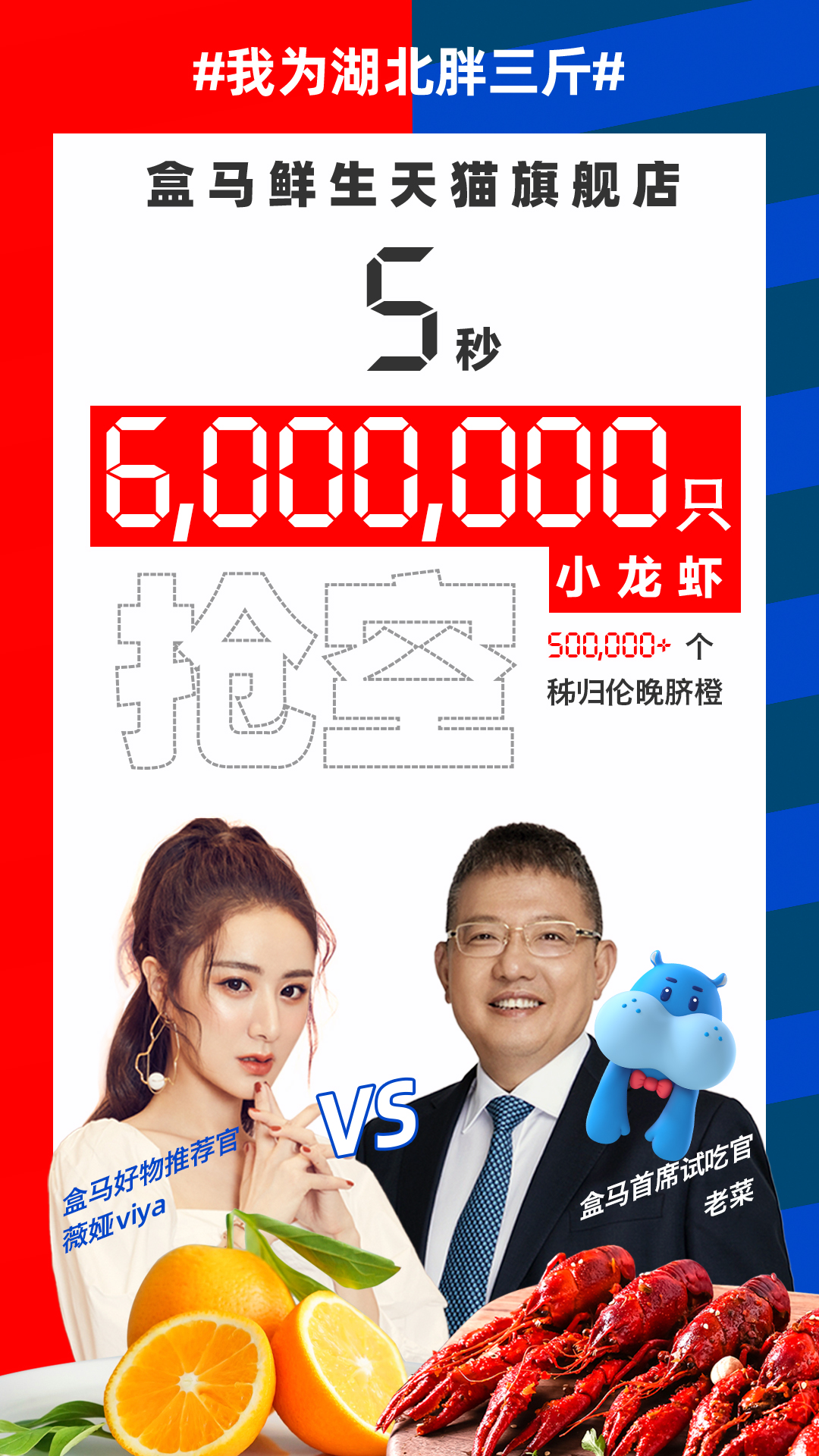 4月21日晚,盒馬總裁侯毅(花名老菜)做客淘寶薇婭直播間,為湖北農(nóng)產(chǎn)品帶貨。侯毅直播時(shí)長(zhǎng)半小時(shí),但僅用時(shí)5秒鐘,盒馬鮮生天貓旗艦店內(nèi),網(wǎng)友就買(mǎi)光了600萬(wàn)只湖北小龍蝦。與小龍蝦一起賣(mài)空的還有秭歸倫晚臍橙。25萬(wàn)斤倫晚,3秒被搶光。超強(qiáng)的帶貨能力,讓兩人獲封“菜見(jiàn)婭”組合。
