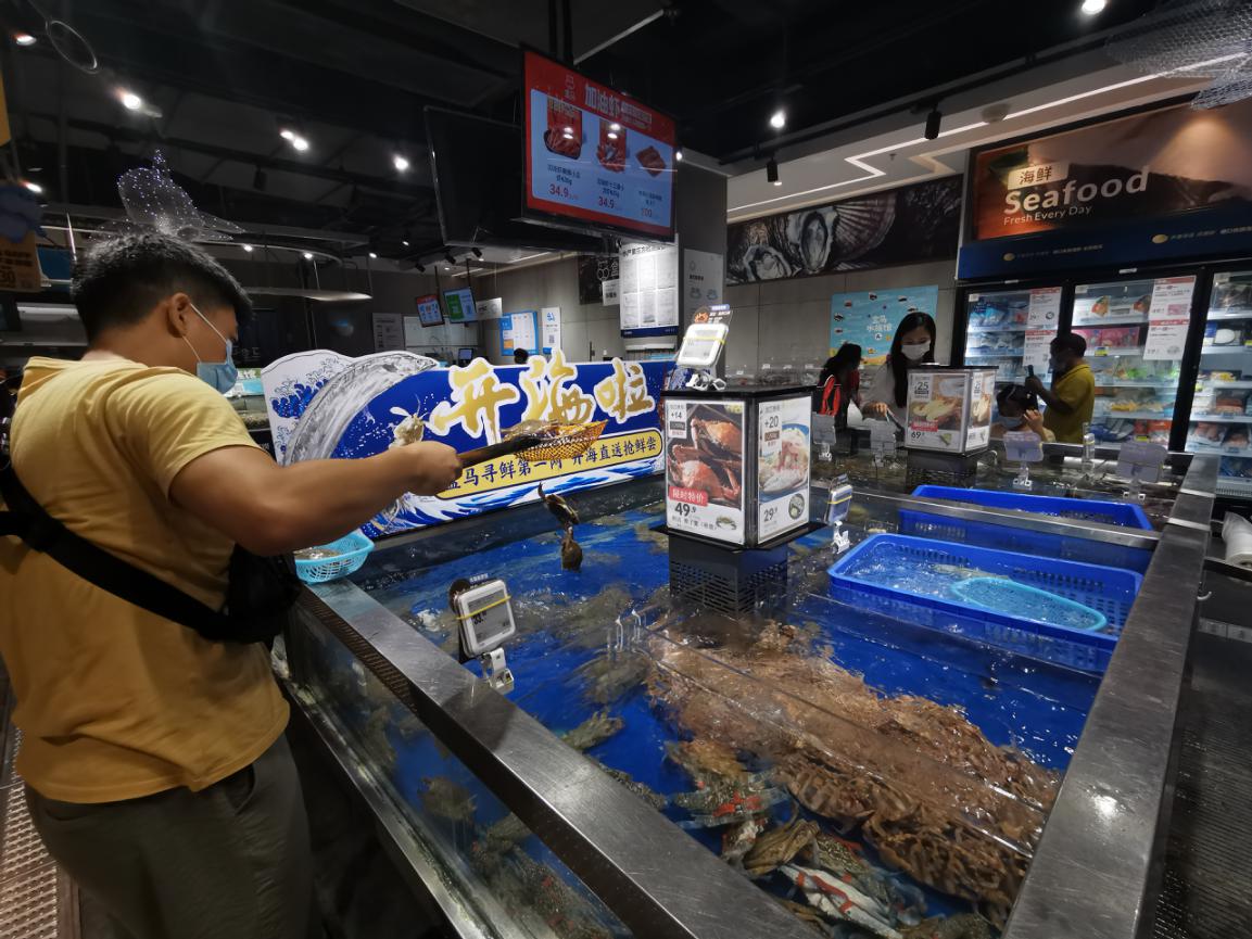 上市第一天,等待已久的市民們爭(zhēng)相購(gòu)買(mǎi)嘗鮮。盒馬廣東門(mén)店的梭子蟹價(jià)格49.9元/斤,周日早上11點(diǎn)不到,第一波入缸的海鮮已經(jīng)被搶空,門(mén)店迅速補(bǔ)貨。