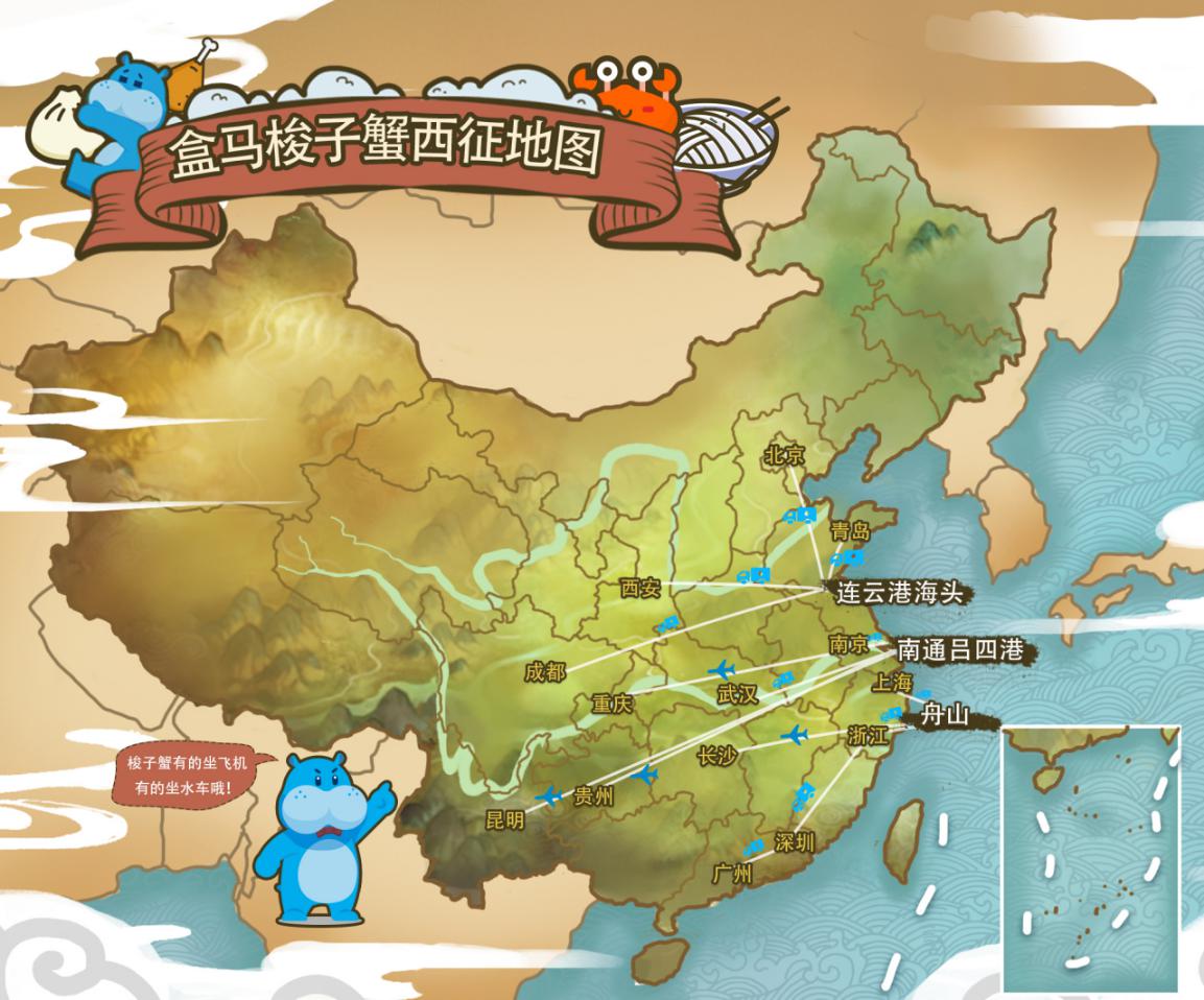 除了浙江舟山,盒馬還在在江蘇呂四、連云港分別設(shè)立了直采基地和純海水恒溫暫養(yǎng)倉(cāng),每個(gè)暫養(yǎng)倉(cāng)可以容納5萬(wàn)斤的梭子蟹和皮皮蝦,可以滿足2 -3天的海鮮供應(yīng)量,并根據(jù)空間距離、物流干線等因素,來(lái)調(diào)撥供應(yīng)近20個(gè)城市的門(mén)店,提升海鮮的鮮活度。