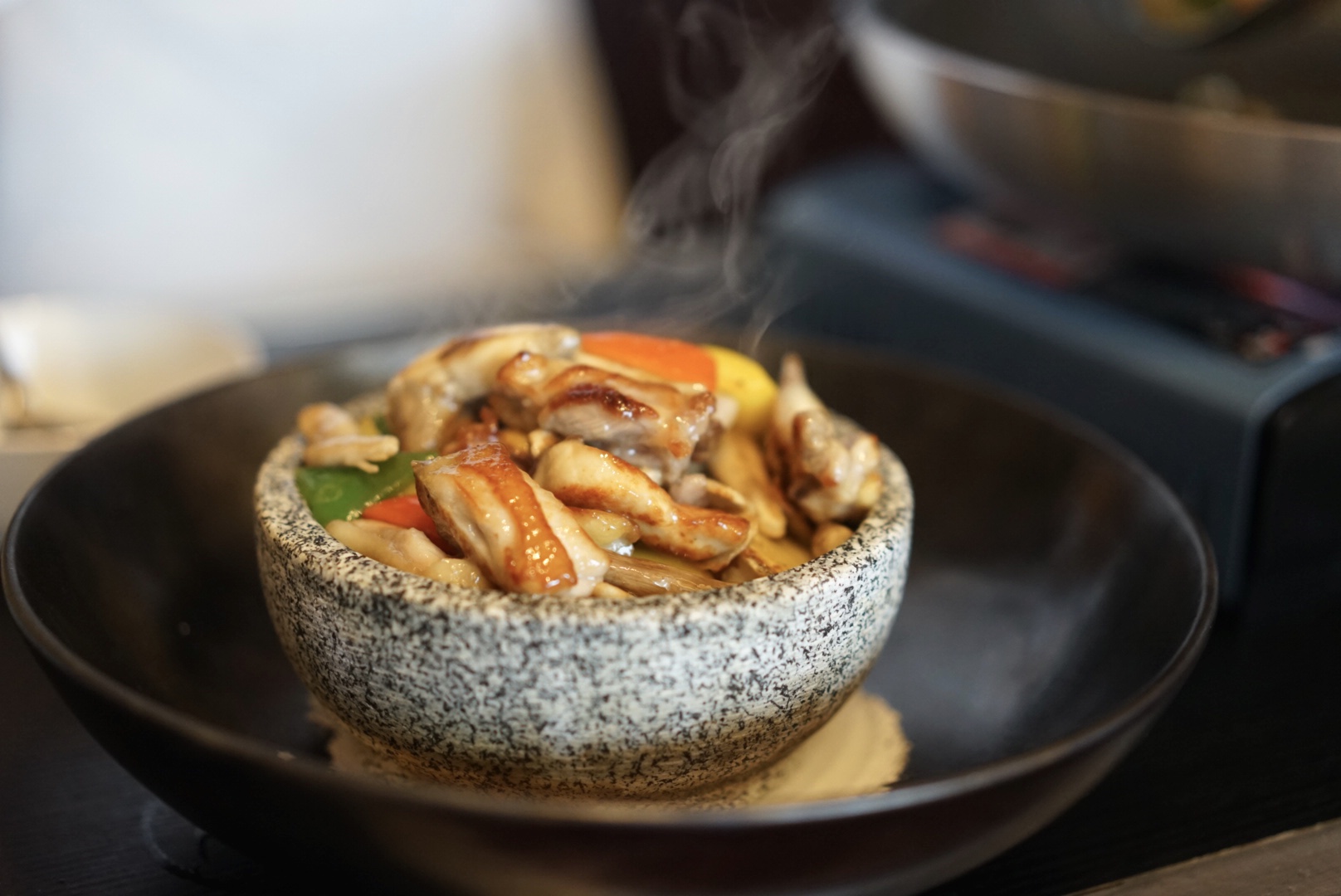 5、準備一石鍋,放入燒熱的蒜粒與紅蔥頭,再將青紅椒、雞樅菌和雞肉等倒入石鍋之中,即可。
