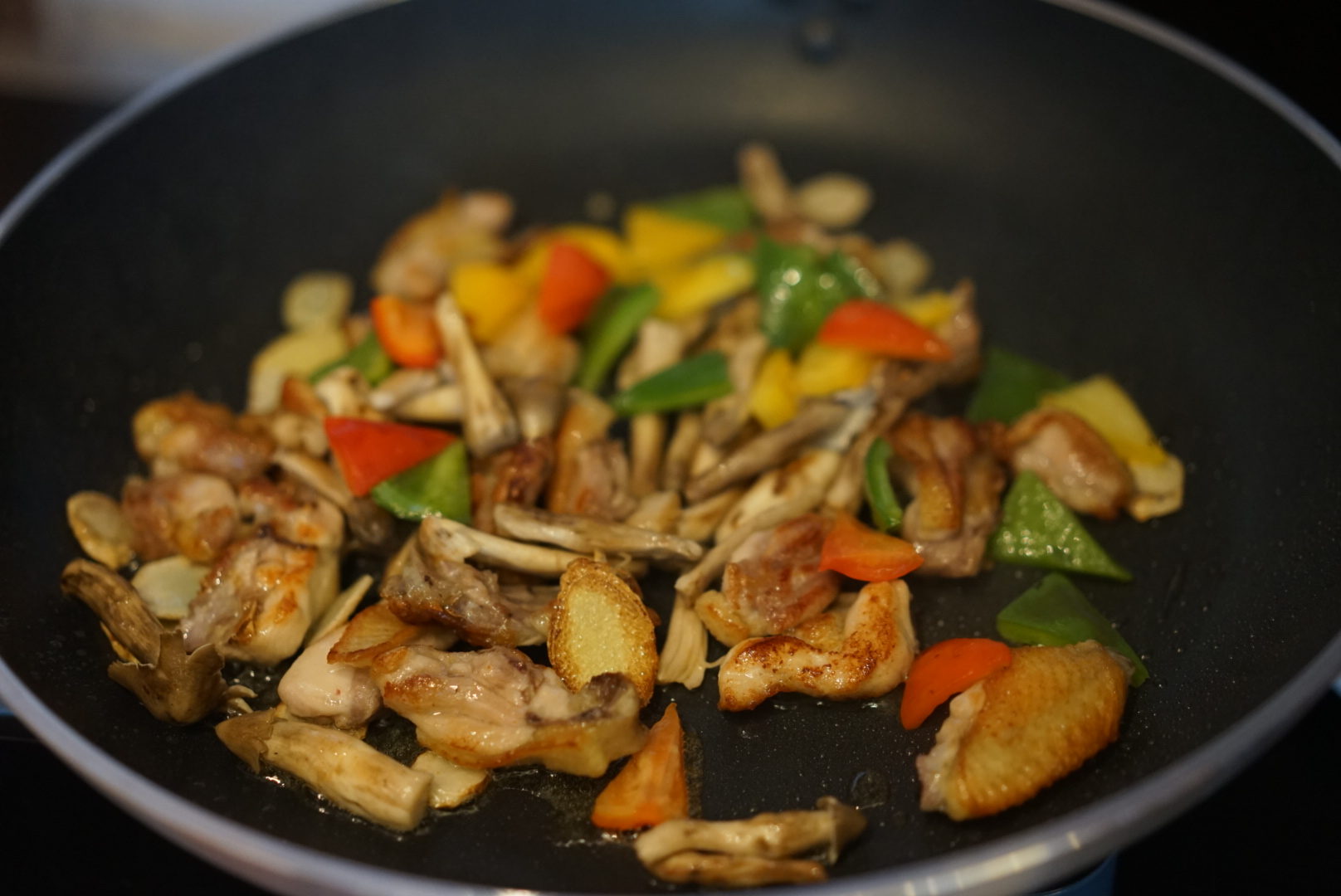 3、等雞肉大約7成熟時,加入沙姜片,用鐵勺輕輕兜炒雞肉與姜片,讓雞肉更加充分吸收姜的風味。雞皮經油溫加熱后,油脂滲出,將鍋中的油勺起,再淋到雞件與姜片上,充分融合。
