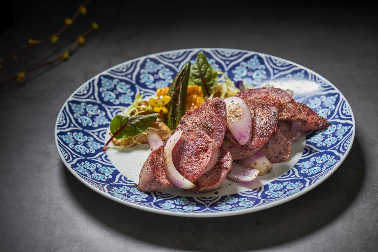 高溫巖燒過的牛舌,撒以黑椒調(diào)味,口感細嫩,厚切帶來的幸福感,激活疲乏味蕾,純粹原始的咸香即瞬蘊繞口腔。