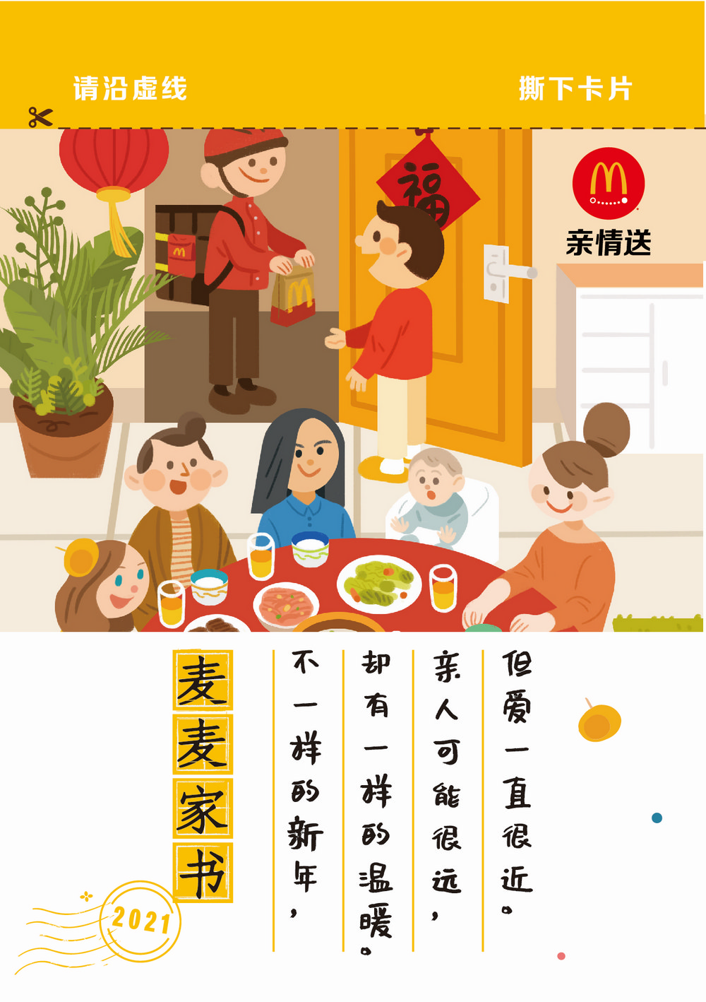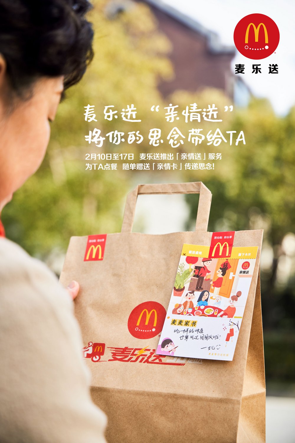 為了讓分隔兩地的顧客表達(dá)對(duì)彼此的思念和祝福,麥樂送于春節(jié)期間推出“親情送”服務(wù)。2月10日至2月17日,在i麥樂送小程序、麥當(dāng)勞App、美團(tuán)麥當(dāng)勞店鋪、餓了么麥當(dāng)勞店鋪,顧客可以選擇“親情送”服務(wù),為遠(yuǎn)在異地的親人朋友點(diǎn)餐,麥樂送會(huì)在訂單中附上【親情卡】,消費(fèi)者可以定制祝福,卡片連同美食將一齊送達(dá)你思念的人手中。