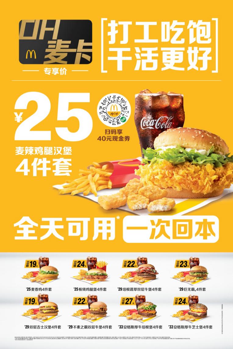 ? OH麥卡全新升級:調(diào)查發(fā)現(xiàn)67%的打工人愿意付費來獲得更大優(yōu)惠。麥當勞OH麥卡職場卡升級多項權(quán)益,為打工人帶來25元招牌產(chǎn)品四件套、早餐麥滿分三件套6折、麥樂送免外送費及代金券等多種優(yōu)惠。OH麥卡的權(quán)限覆蓋打工人生活中的多個場景,在到店取餐、麥樂送、麥咖啡等多個渠道都可以全天使用。