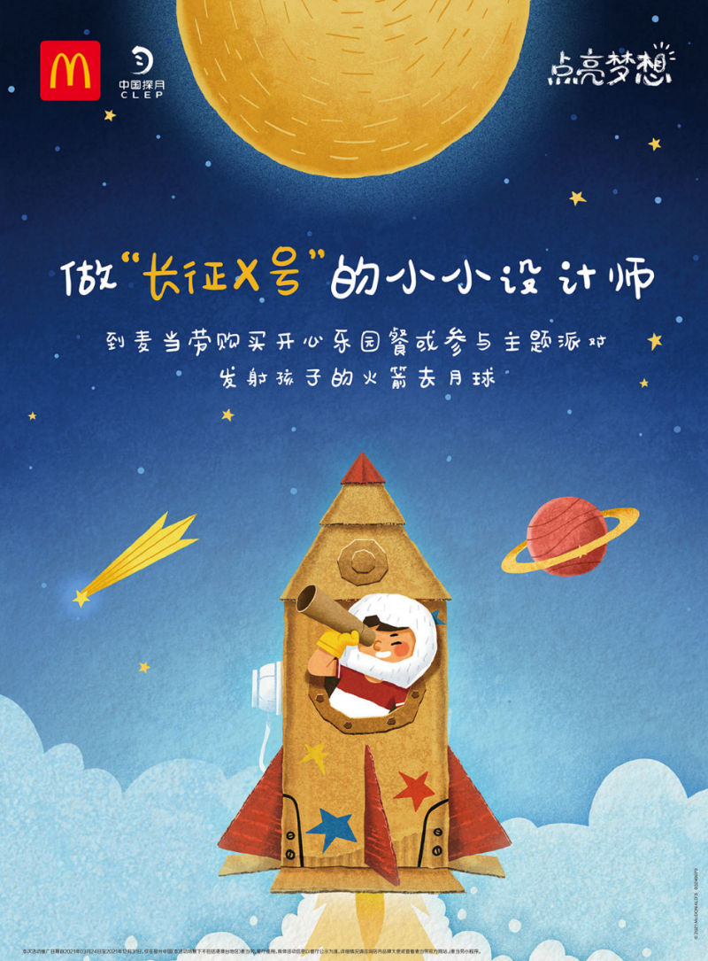 2021點亮夢想活動,是麥當(dāng)勞與中國探月的二度合作,雙方再次聯(lián)合守護夢想,并鼓勵動手實踐,做到“敢夢敢想敢為”。
