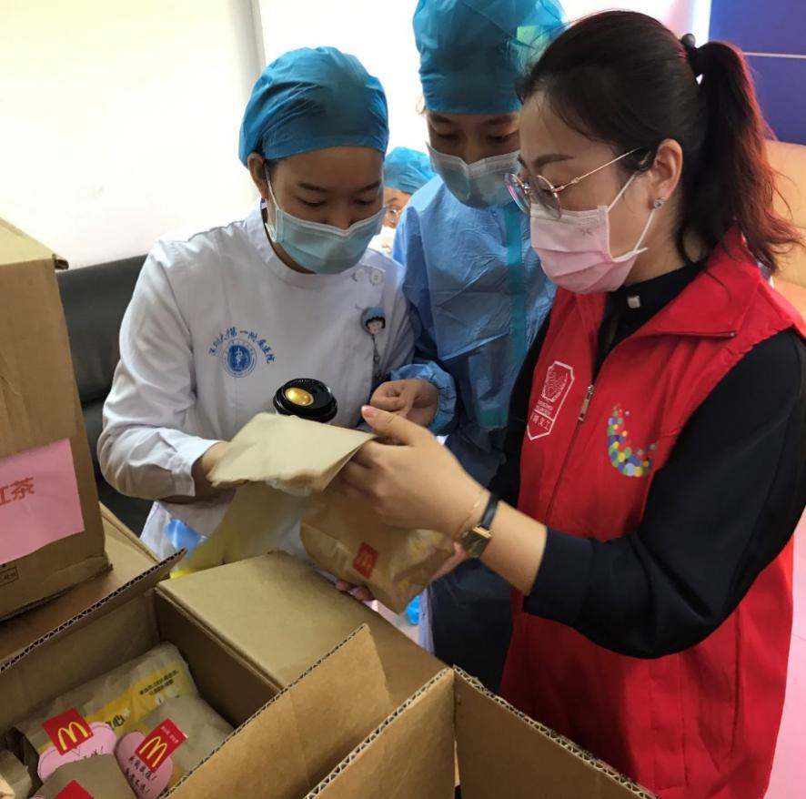 深圳麥當(dāng)勞“麥麥義工團(tuán)”小伙伴們?yōu)榭挂咭痪€醫(yī)護(hù)人員送去愛(ài)心餐食