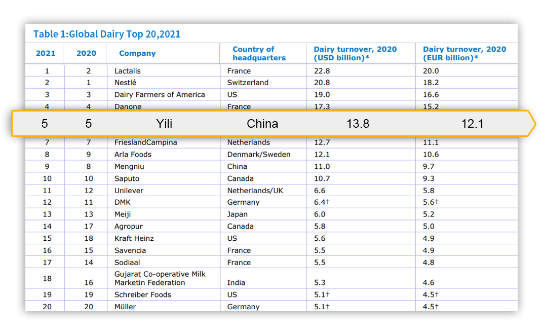 伊利蟬聯(lián)全球乳業(yè)五強(qiáng)、連續(xù)8年穩(wěn)居亞洲乳業(yè)第一