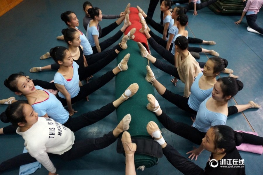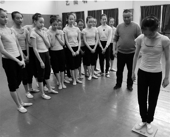 2月21日,記者來到浙江藝術(shù)職業(yè)學院舞蹈系,看著那個骨瘦如柴的女孩子輕盈地跳上體重秤,顯示是43.6公斤?!疤炖?,超重了超重了,要跑10圈了!”她說。