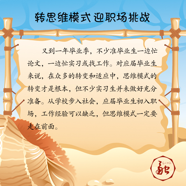 又到一年畢業(yè)季,不少準(zhǔn)畢業(yè)生一邊忙論文,一邊忙實(shí)習(xí)或找工作。對(duì)應(yīng)屆畢業(yè)生來說,在眾多的轉(zhuǎn)變和適應(yīng)中,思維模式的轉(zhuǎn)變才是根本,但不少實(shí)習(xí)生并未做好充分準(zhǔn)備。從學(xué)校步入社會(huì),應(yīng)屆畢業(yè)生初入職場(chǎng),工作經(jīng)驗(yàn)可以缺乏,但思維模式一定要走在前面。