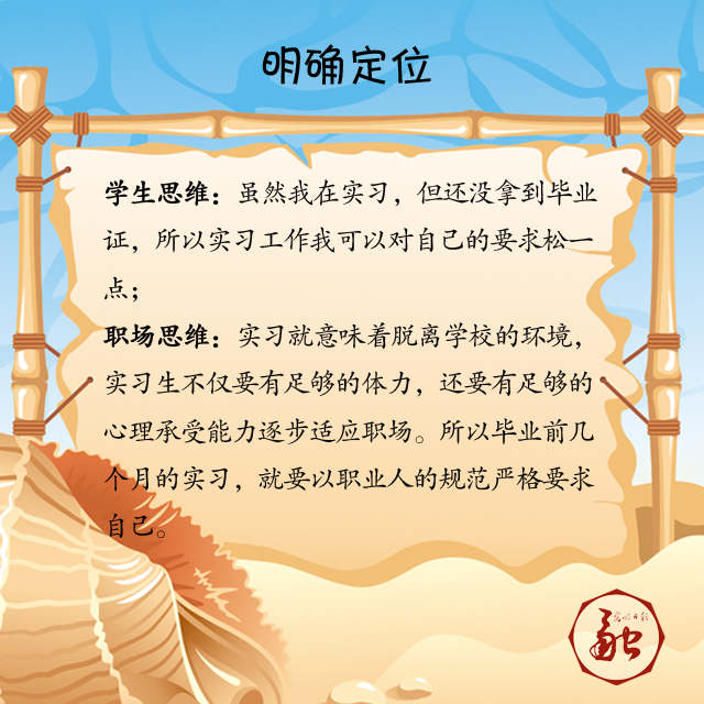 職場(chǎng)思維:實(shí)習(xí)就意味著脫離學(xué)校的環(huán)境,實(shí)習(xí)生不僅要有足夠的體力,還要有足夠的心理承受能力逐步適應(yīng)職場(chǎng)。畢業(yè)前幾個(gè)月的實(shí)習(xí),就要以職業(yè)人的規(guī)范嚴(yán)格要求自己。