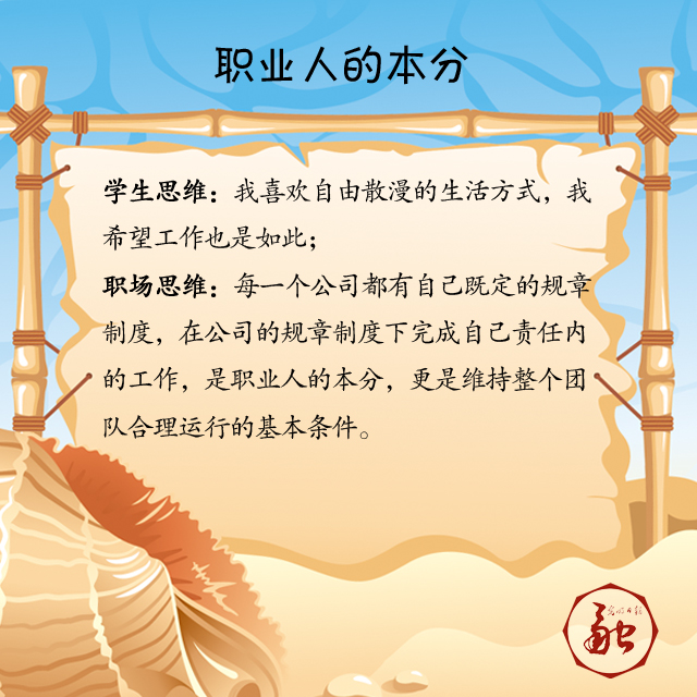 職場(chǎng)思維:每一個(gè)公司都有自己既定的規(guī)章制度,在公司的規(guī)章制度下完成自己責(zé)任內(nèi)的工作,是職業(yè)人的本分,更是維持整個(gè)團(tuán)隊(duì)合理運(yùn)行的基本條件。