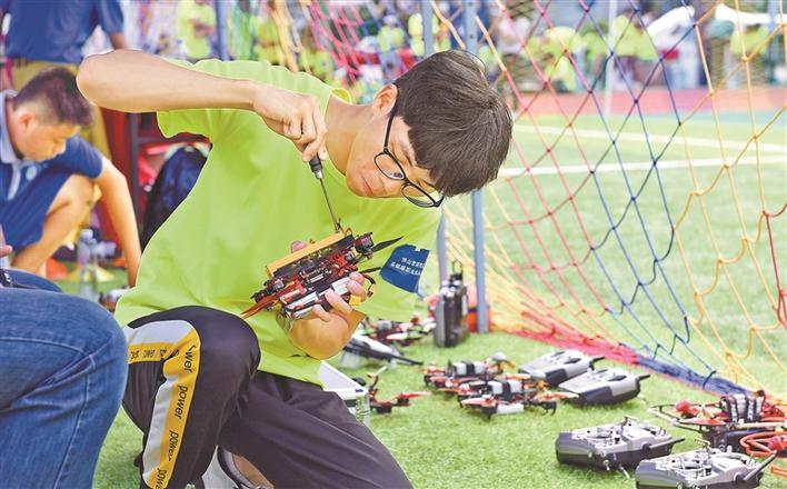 參加“無人機(jī)挑戰(zhàn)賽”的選手為比賽做準(zhǔn)備。