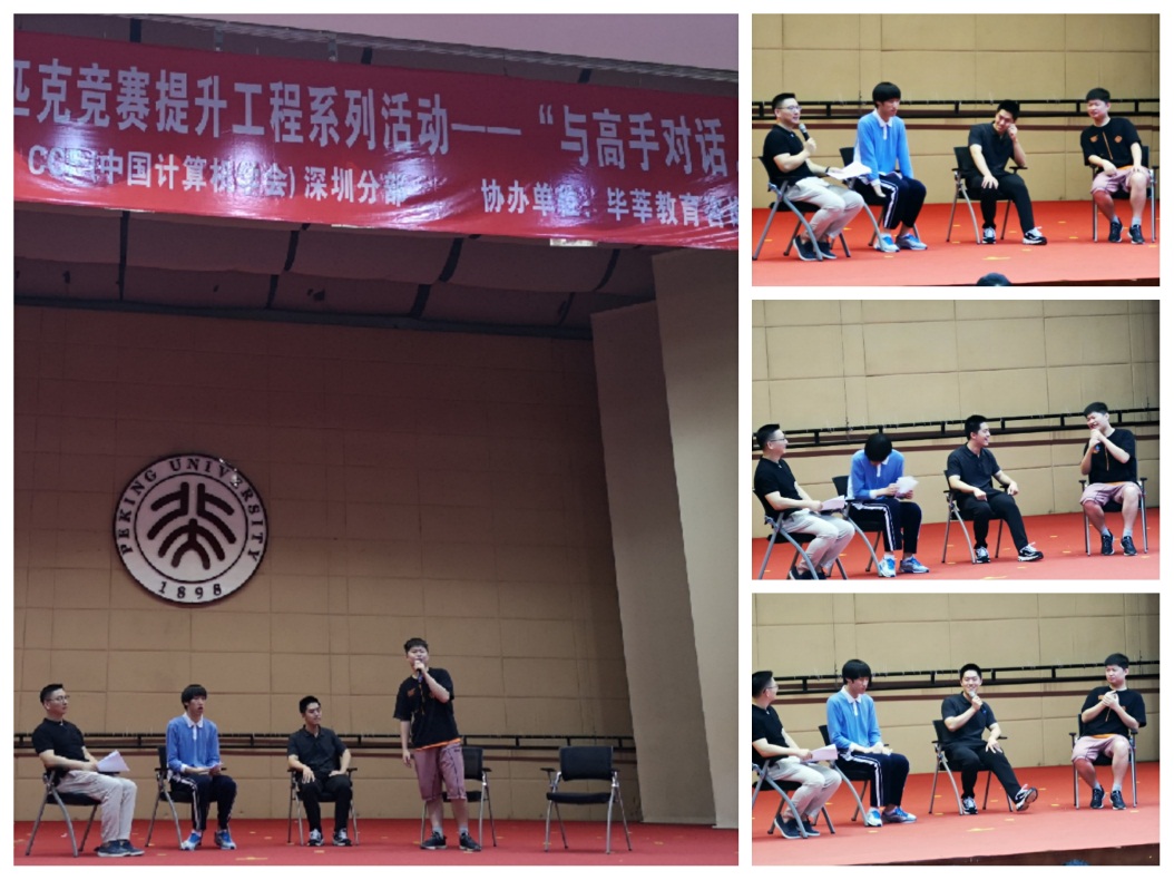 本次活動除了邀請周楷文同學親臨現(xiàn)場之外,還邀請了雅禮中學正高級教師,為雅禮貢獻了9塊IOI金牌的朱全民老師;北京大學深圳研究生院計算機專業(yè)雷凱副教授;雅禮中學畢業(yè),通過信息學競賽保送到北京大學信息科學與技術(shù)學院計算機專業(yè)就讀本科以及研究生的章嘉晨同學,國際大學生信息學競賽(ICPC)區(qū)域賽金獎、報送北京大學深圳研究生院就讀計算機專業(yè)的陳銳彪同學。