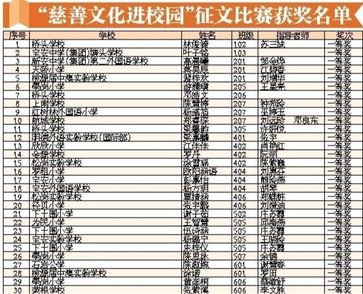 寶安日報(bào)2020年1月2日訊 2019年12月31日下午,寶安區(qū)慈善文化進(jìn)校園征文比賽表彰暨2019年度工作總結(jié)會(huì)在寶安實(shí)驗(yàn)學(xué)校會(huì)議室舉行。會(huì)上對(duì)征文比賽獲獎(jiǎng)?wù)吆蛢?yōu)秀組織單位進(jìn)行表彰。學(xué)生代表分享慈善故事,學(xué)校代表則分享慈善文化進(jìn)校園經(jīng)驗(yàn)。此次慈善文化進(jìn)校園征文活動(dòng)是由區(qū)教育局、區(qū)慈善會(huì)、寶安日報(bào)社、寶安廣電中心共同主辦,征文主題是“慈善在我身邊”,活動(dòng)在全區(qū)中小學(xué)生中進(jìn)行征集。經(jīng)過兩個(gè)月的征集和評(píng)比,最終評(píng)出3個(gè)組別的一、二、三等獎(jiǎng)和優(yōu)秀組織單位。