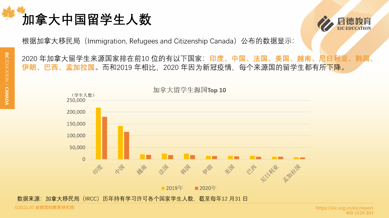 另一組數(shù)據(jù)顯示,2020年中國內(nèi)地學(xué)生新增人數(shù)最多的三個省為安大略?。?9.78% )、英屬哥倫比亞省(26.17% )、魁北克?。?.49% )。一方面,安大略省與英屬哥倫比亞省這兩個省份的教育資源非常豐富,有多所世界知名大學(xué)讓中國學(xué)生選擇;另一方面,多倫多、溫哥華、渥太華等大城市均在這兩個省份,工作機會多,移民政策也相對成熟,對希望留在加拿大發(fā)展的留學(xué)生很具吸引力。