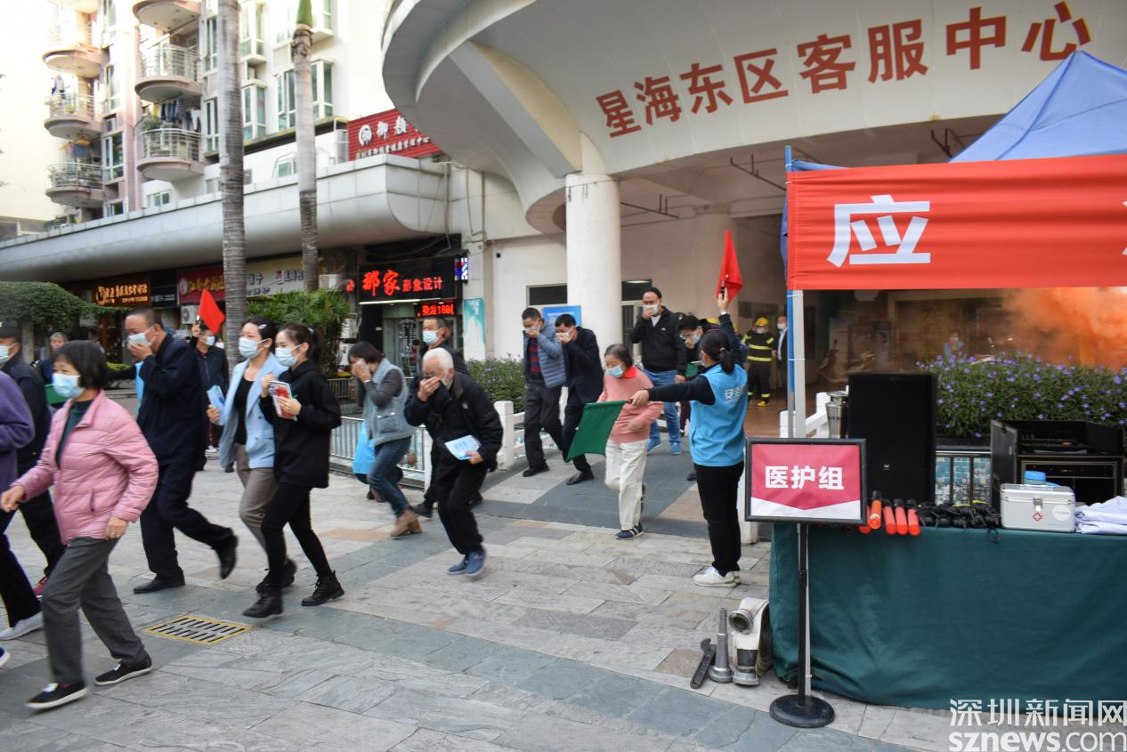 演練情景設(shè)定為巡查人員發(fā)現(xiàn)火情,第一時間向社區(qū)安全相關(guān)負(fù)責(zé)人匯報,安保處立刻報警并啟動消防應(yīng)急預(yù)案。隨后火警警報驟響,樓道內(nèi)冒出濃煙,疏散演練正式開始。居民們在工作人員的指揮下,用口罩、衣服等捂口鼻,屈膝彎腰沿著既定的疏散路線,迅速向安全區(qū)域撤離。隨后社區(qū)消防員趕赴現(xiàn)場,使用高壓水槍撲滅火災(zāi),解除警報。演練結(jié)束后,社區(qū)還組織居民參加安全體驗活動。