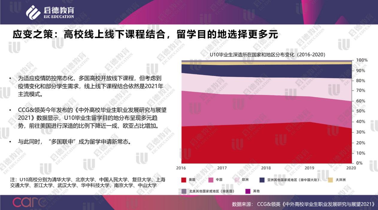 全球化智庫(kù)與領(lǐng)英發(fā)布的《中外高校畢業(yè)生職業(yè)發(fā)展研究與展望2021》數(shù)據(jù)顯示,中國(guó) U10 (清華大學(xué)、北京大學(xué)、中國(guó)人民大學(xué)、復(fù)旦大學(xué)、上海交通大學(xué)、浙江大學(xué)、武漢大學(xué)、華中科技大學(xué)、南京大學(xué)、中山大學(xué) )畢業(yè)生繼續(xù)深造的國(guó)家與地區(qū)選擇更趨多樣化,前往美國(guó)留學(xué)的比例下降近一成,留學(xué)亞洲與歐洲的占比增加。