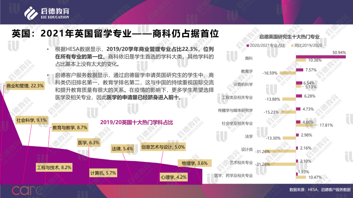 長(zhǎng)期以來(lái),由于其廣闊的就業(yè)前景,F(xiàn)AME專業(yè)(金融、會(huì)計(jì)、管理、經(jīng)濟(jì))和STEM專業(yè)(科學(xué)、技術(shù)、工程和數(shù)學(xué))一直備受留學(xué)生的青睞。2021 《美國(guó)門戶開(kāi)放報(bào)告》數(shù)據(jù)顯示,半數(shù)以上的中國(guó)內(nèi)地學(xué)生就讀STEM專業(yè)(物理/自然科學(xué)、工程學(xué)、醫(yī)療健康、數(shù)學(xué) /計(jì)算機(jī) ),16.6%就讀商業(yè)與管理專業(yè)。英國(guó)高等教育統(tǒng)計(jì)局 HESA數(shù)據(jù)顯示,2019/20學(xué)年商業(yè)管理專業(yè)占比為22.3%,位列在英國(guó)研究生專業(yè)的第一位,其他依次為:社會(huì)科學(xué)、教育與教學(xué)、工程與技術(shù)、醫(yī)學(xué)、計(jì)算機(jī)、法律、創(chuàng)意藝術(shù)與設(shè)計(jì)、心理學(xué)以及物理學(xué)。