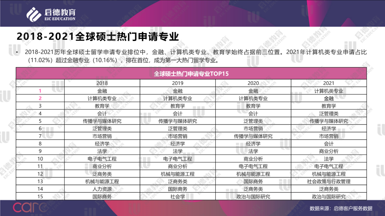 啟德留學(xué)客戶服務(wù)數(shù)據(jù)顯示,2018-2021歷年全球碩士留學(xué)申請(qǐng)專業(yè)排位中,金融、計(jì)算機(jī)類專業(yè)、教育學(xué)始終占據(jù)前三位置。2021年,計(jì)算機(jī)科學(xué)與信息系統(tǒng)(偏理科)、計(jì)算機(jī)科學(xué)與信息系統(tǒng)(偏工科)、電子與計(jì)算機(jī)工程、數(shù)據(jù)科學(xué)這四個(gè)計(jì)算機(jī)類專業(yè)的碩士申請(qǐng)占比合計(jì)為11.02%,超過(guò)金融專業(yè)(10.16%),成為第一大熱門留學(xué)專業(yè)。2021商科申請(qǐng)占比超過(guò)40%,理工科申請(qǐng)占比超過(guò)四分之一。其中,商科熱門碩士專業(yè)金融(10.16% )、經(jīng)濟(jì)學(xué)(4.63% )、市場(chǎng)營(yíng)銷(4.43% )、會(huì)計(jì)(3.92% )、商業(yè)分析(2.99% )的申請(qǐng)占比為26.13%,理工科熱門碩士專業(yè)計(jì)算機(jī)(11.02% )、電子電氣工程(2.66% )、機(jī)械與能源工程(2.15% )的申請(qǐng)占比為15.83%。