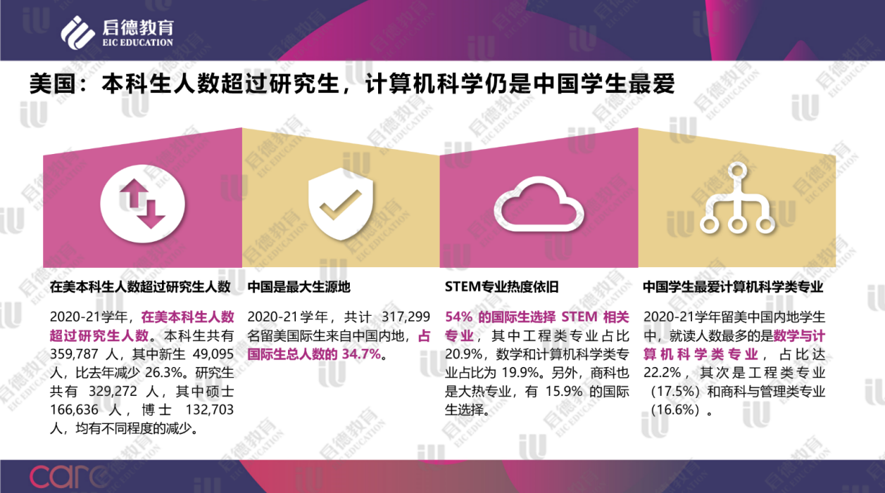 據(jù)2021 《美國(guó)門戶開(kāi)放報(bào)告》數(shù)據(jù)顯示,2020/21學(xué)年共有914,095名國(guó)際學(xué)生在美國(guó)高等教育機(jī)構(gòu)學(xué)習(xí),中國(guó)內(nèi)地(317,299人)依舊是美國(guó)最大的生源地區(qū),在國(guó)際學(xué)生中占比為34.7%,其中本研占比分別是39.6%與37.5%。