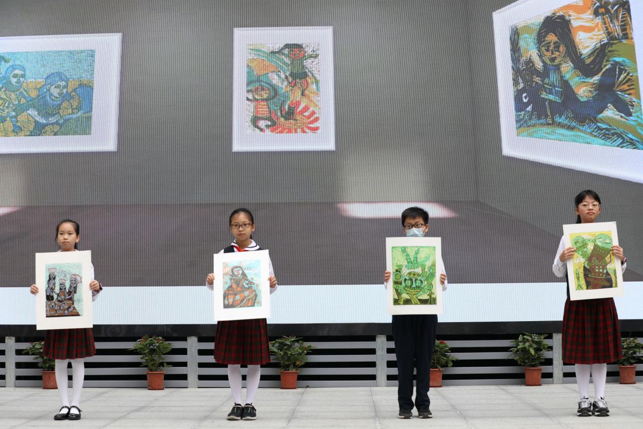 與開館和展覽同時推出的,還有“榕”美術館的云展館。云展館以新媒體形式,擴大了展覽范圍,使得學校的美術美育成果得以向外部展示。推出之際,學校舉行了云展館的剪彩儀式。解署昱校長致辭并宣布開館,福田區(qū)教科院藝術辦林影萍主任、解署昱校長、劉權祥副校長、姚紅霞副校長為云美術館剪彩,并向全校學生贈送了云展館資料。