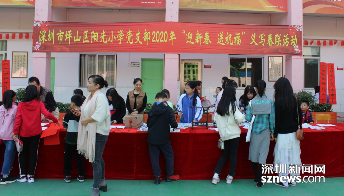 近日,深圳市坪山區(qū)陽(yáng)光小學(xué)開(kāi)展“迎新春 送祝?!绷x寫(xiě)春聯(lián)活動(dòng),老師們現(xiàn)場(chǎng)揮毫?xí)鴮?xiě)一副副寓意新春祝福的春聯(lián),為社區(qū)居民、家長(zhǎng)奉上美好祝愿。